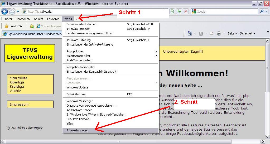 Login mit Internet Explorer 8Bitte den Schritten (1-8) folgen.Schritt 1: Im Internet Explorer den Menüpunkt "Extras" auswählen. Schritt 2: Ganz unten auf "Internetoptionen" klicken.