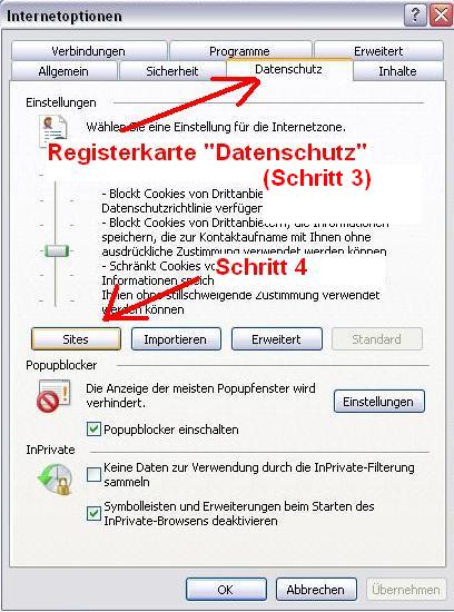 Schritt 3: Die Registerkarte "Datenschutz" auswählen. Schritt 4: Auf den Punkt "Sites" klicken.