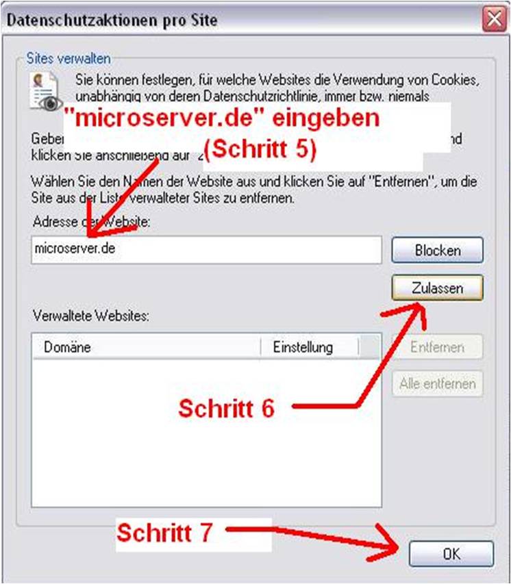 Schritt 5: In das Feld "Adresse der Webseite:" die Seite "microserver.de" eintragen. Schritt 6: Auf den Punkt "Zulassen" klicken. Schritt 7: Zweimal bestätigen mit einem Klick auf "OK".